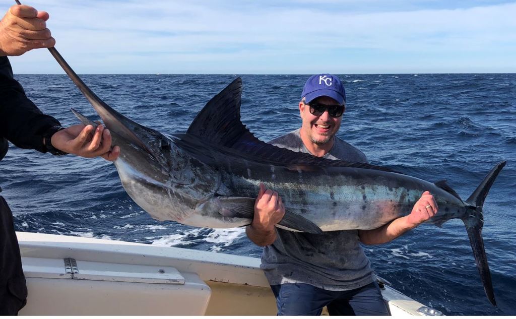 Mark looked happy, somewhat stunned, and tired as we took pictures. None of us, Mark included, could take our eyes off the fish Mark had fought for nearly an hour. It was now either brain dead or fully dead from his beating. After all the pictures had been taken, they laid the fish across the width of the boat. From the end of his beak to the end of his tail, he was only about three inches shorter than the boat-width.