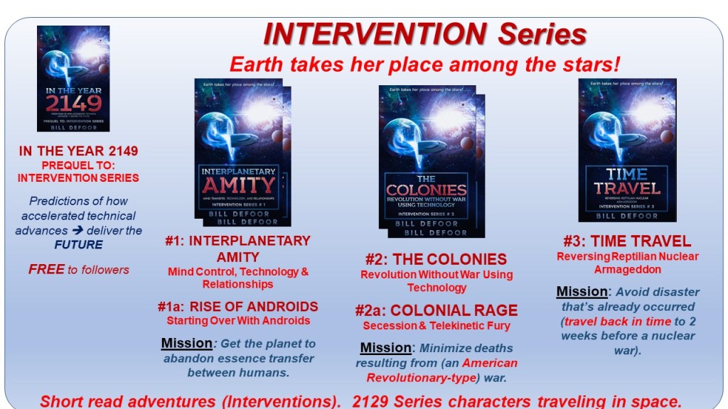 The Intervention Series follows the 2129 Series characters in short stories and Star Trek-type storylines. Earth has mastered space travel and participates in an Interplanetary Federation Intervention Program (IFIP). The IFIP monitors planetary development across universes. They dispatch mentors, targeting key individuals on a distant planet to benefit their species, much like Bill was targeted to advance Earth’s programs.